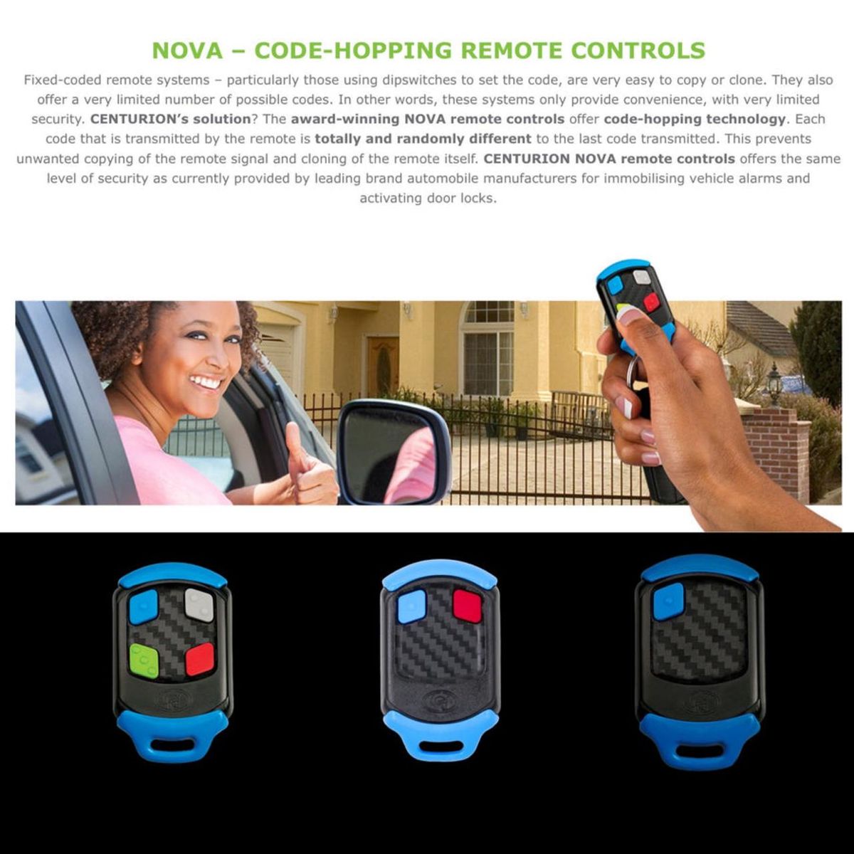 The Centurion Nova 4-Button Garage Remote Control is a trusted solution for managing your gate and garage door systems. Built with advanced code-hopping technology, it ensures your signal remains secure and cannot be easily cloned—giving you peace of mind for your property.