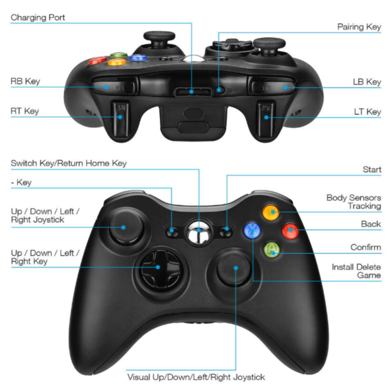 Wireless Xbox 360 Gamepad for both PC and Xbox 360. Ergonomic, vibration-enabled, with 2.4GHz wireless range up to 9m. Compatible with Windows XP/7/10. Powered by AA or rechargeable battery.