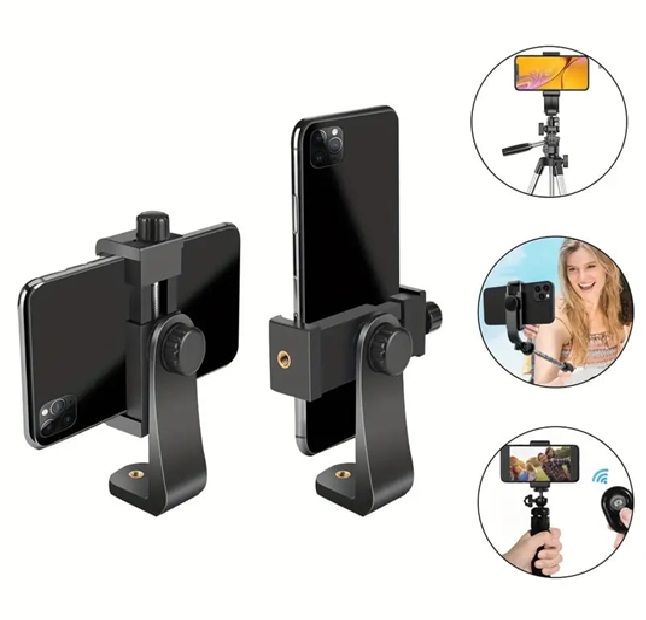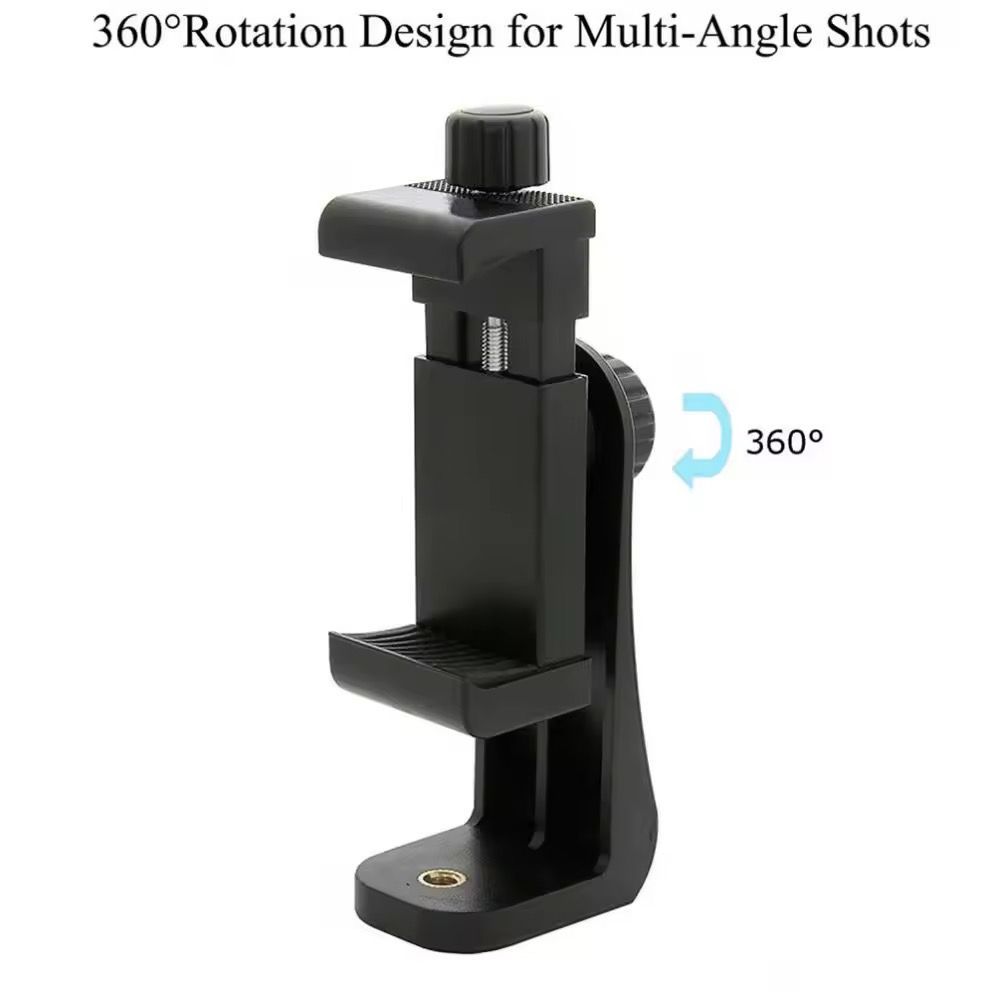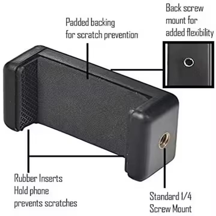 Capture steady, high-quality photos and videos with the Universal Phone Tripod Mount Holder. Designed for versatility and durability, this adjustable clip securely holds your smartphone and connects effortlessly to tripods, monopods, and ring lights using a standard 1/4” screw mount.